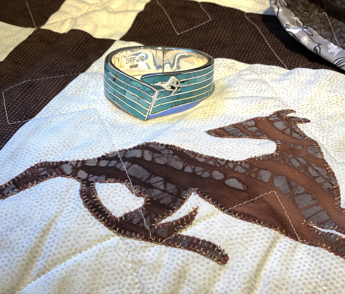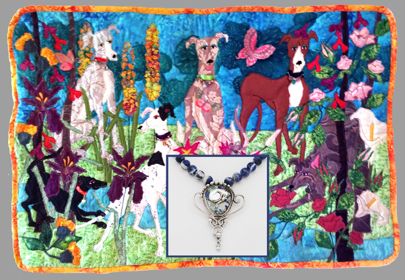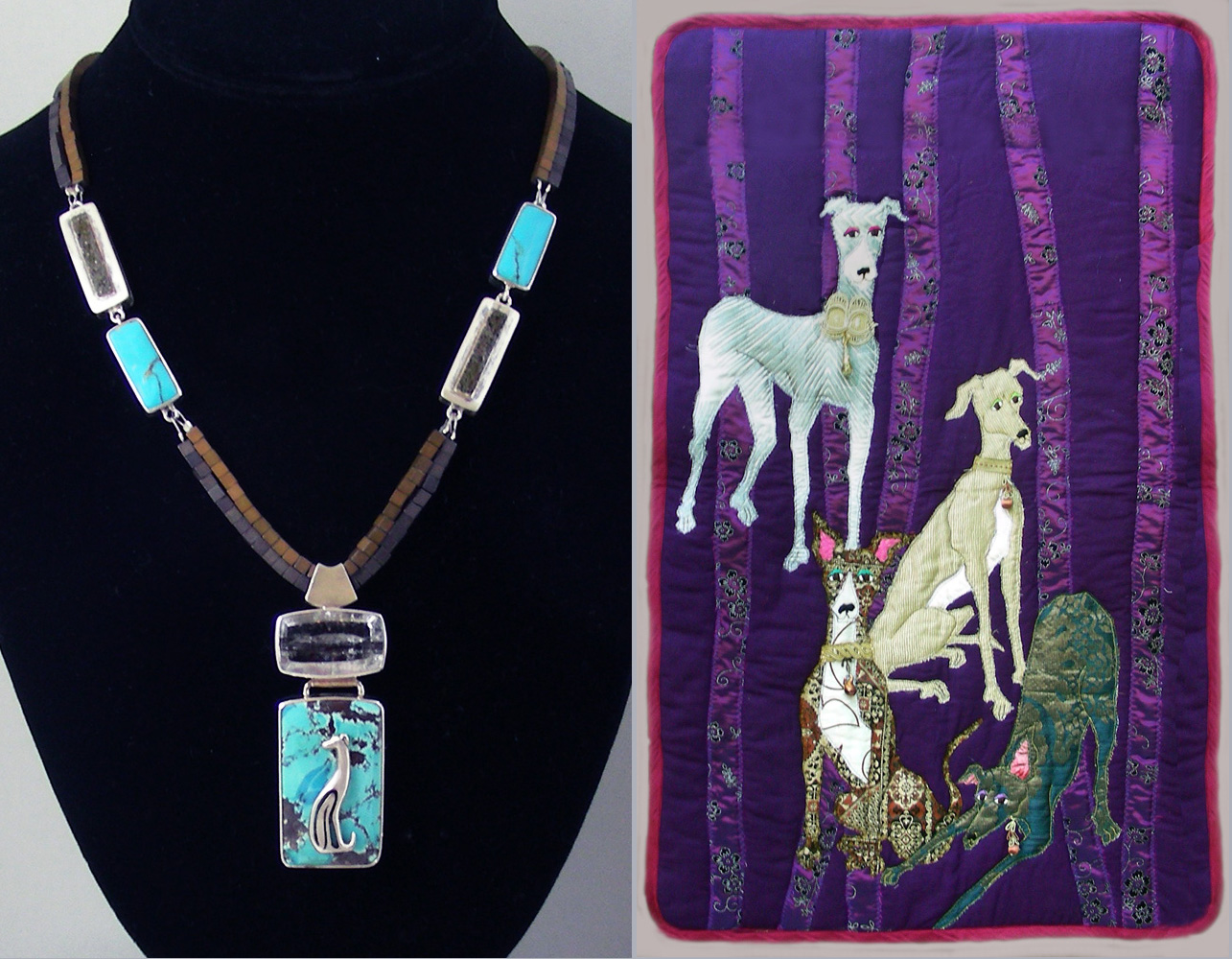Win this 42" X 25" wall hanging by Susan Lewis of particularly elegant fabrics AND this 24" necklace of Turquoise, Tourmalinated Quartz and Mahogany Obsidian- ALL in Raffle #42 for The Greyhound Adoption League of Texas!